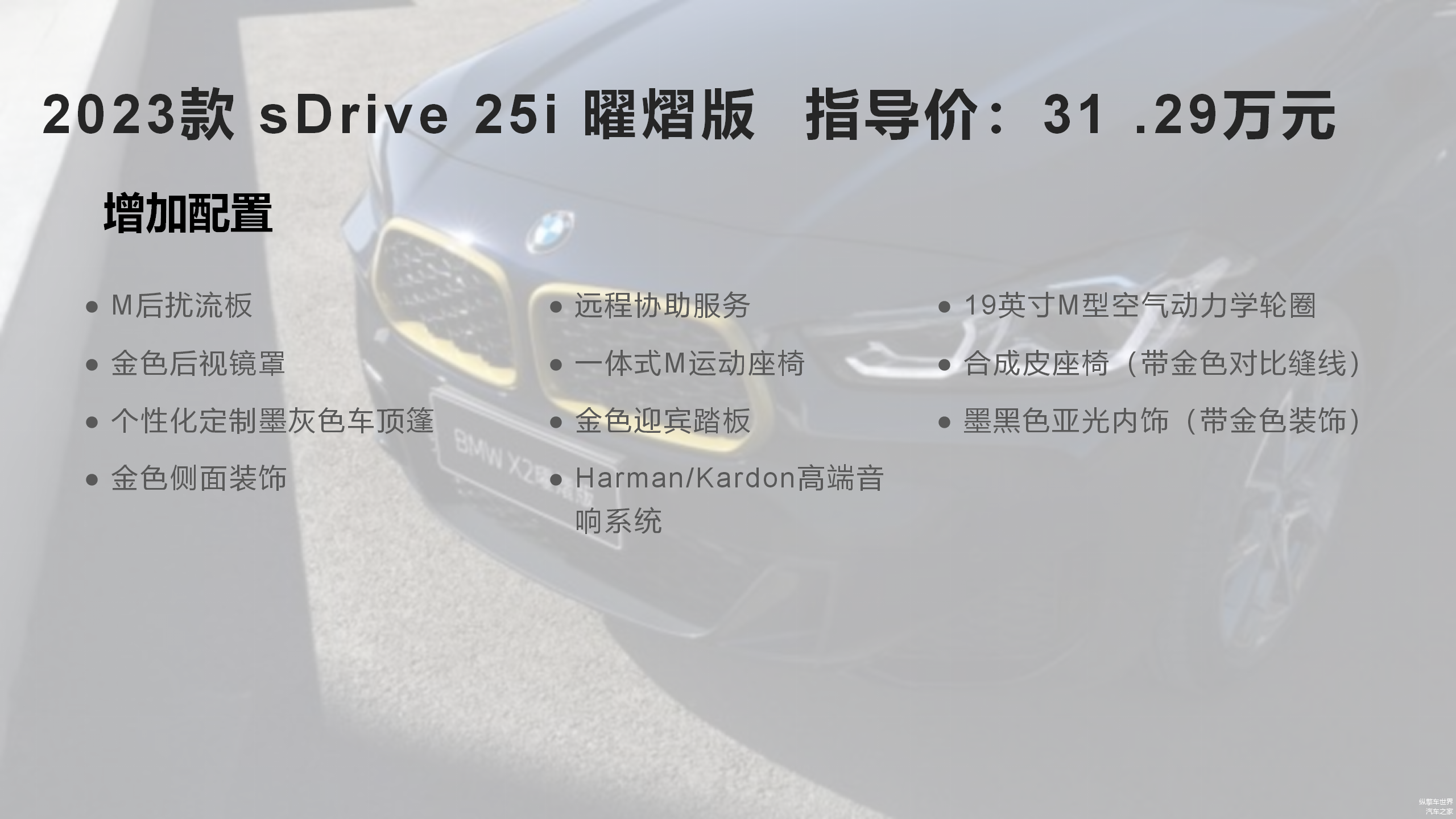 作为新增车型,sDrive 25i 曜熠版除了运动耀熠套装独有的金色后视镜罩、车侧金色装饰、金色迎宾踏板等,还增加了M后扰流板、哈曼卡顿音响、19英寸大轮圈等,价格比上一版本贵2万,如果你能接受这样高调的土豪金外观,选择这个版本能让你获得不小的回头率。