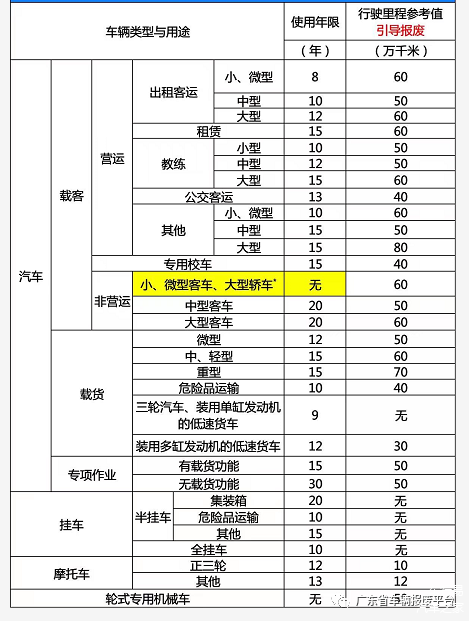 例如小、微型的出租客运汽车的强制报废年限是8年;公交客运类汽车的强制报废年限是13年;危险品运输车辆的强制报废年限是10年等。