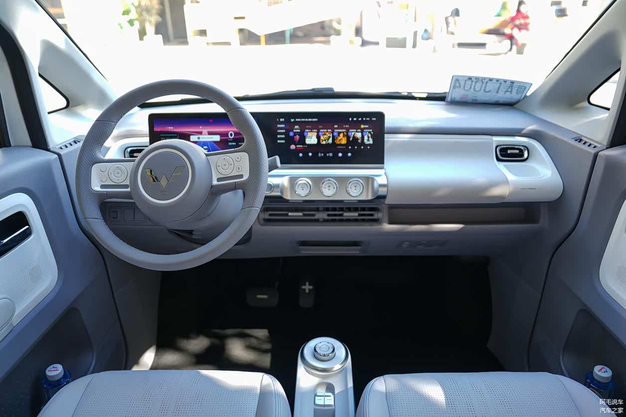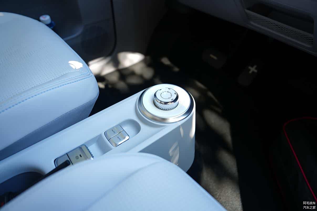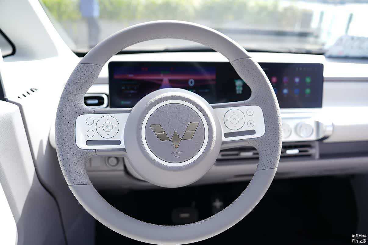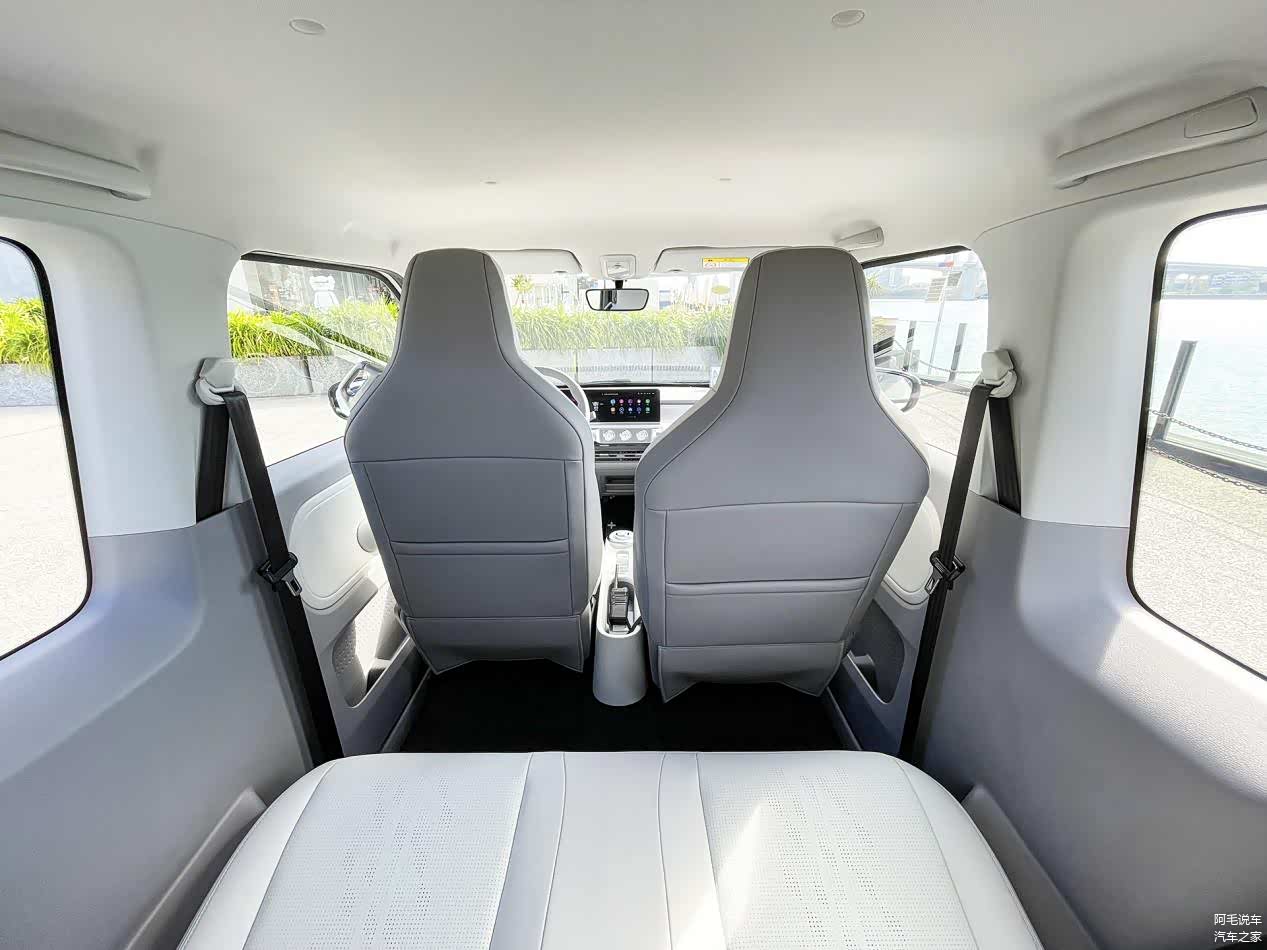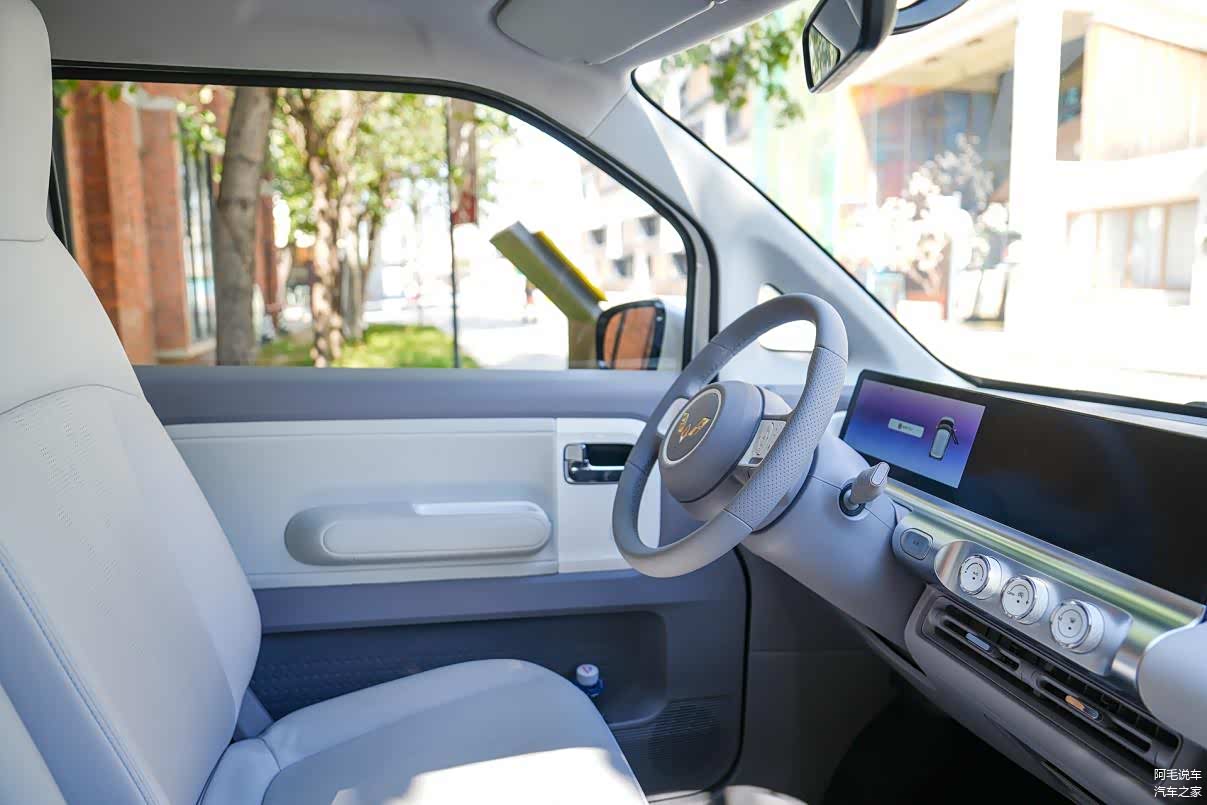 除了视觉效果简约、科技感十足以外,在触觉上Air ev晴空也有着不错的表现。Air ev睛空整车都配有皮质座椅、皮质方向盘、皮质包覆扶手,对于车内乘客来说,触感细腻,极具高档质感。而在座椅上,采用了皮质座椅,使用星际形打孔工艺,透气性好,乘坐体验也得到的提升,从整体上来看,五菱在内饰搭配上还是下了不少功夫的。
