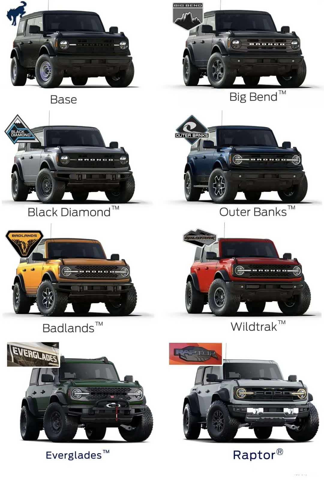 根据使用侧重点不同,福特Bronco目前可提供8个款型可选。其中,Bronco猛禽基于Badlands版本开发,并在其基础上主要针对悬架、传动和动力系统进行升级,从而更加适用于沙漠、戈壁的高速行驶和岩石攀爬等路况。当然,福特也提供与Bronco猛禽性能侧重明显不同的车款,比如Bronco Everglades版本就更加适合于涉水和沼泽等泥泞路况,标配有涉水喉和提高自救能力的前绞盘等配置。