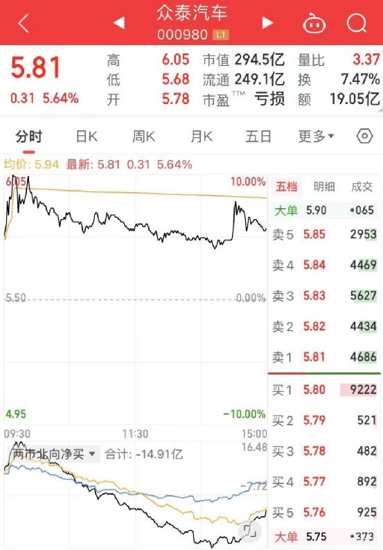 19号的开盘那天,众泰公司股价快速冲高,并在几分钟之后涨停,当天报收于5.81元/股,涨5.64%,全天成交19.05亿元。