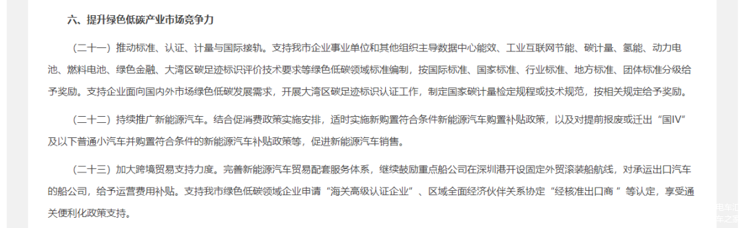近日,深圳市政府办公厅发布了《深圳市促进绿色低碳产业高质量发展若干措施》,其中提到,要持续推广新能源汽车。结合促消费政策实施安排,适时实施新购置符合条件新能源汽车购置补贴政策,以及对提前报废或迁出“国Ⅳ”及以下普通小汽车并购置符合条件的新能源汽车补贴政策等,促进新能源汽车销售。
