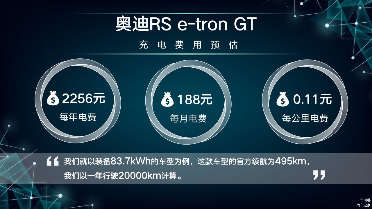 综合了保险、保养以及充电费用,我们得到奥迪RS e-tron GT每年的开销大概在29698元,每个月的平均花费为2475元,整体的花费还是得益于纯电动车的身份显得非常便宜好养活。