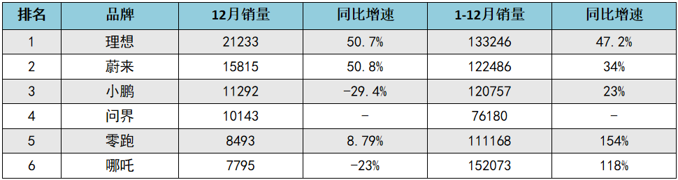 如果按照月度销量来排序,2022年12月份的排名是理想、蔚来、小鹏、问界、零跑和哪吒。但年度排名则是哪吒、理想、蔚来、小鹏、零跑和问界。
