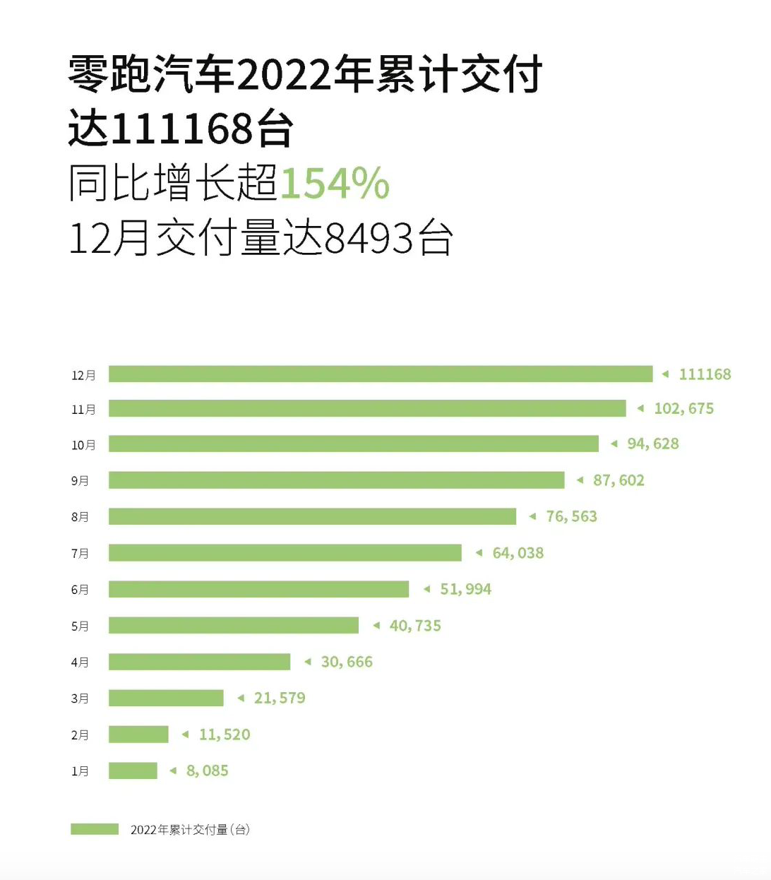 随着该品牌12月交付数据的出炉,其全年销量也愈发显著。销量数据显示,2022年12月零跑交付新车达8493台,2022全年累计交付新车达111168台,累计交付同比增长超154%,领先2022年中国新能源汽车增长率。