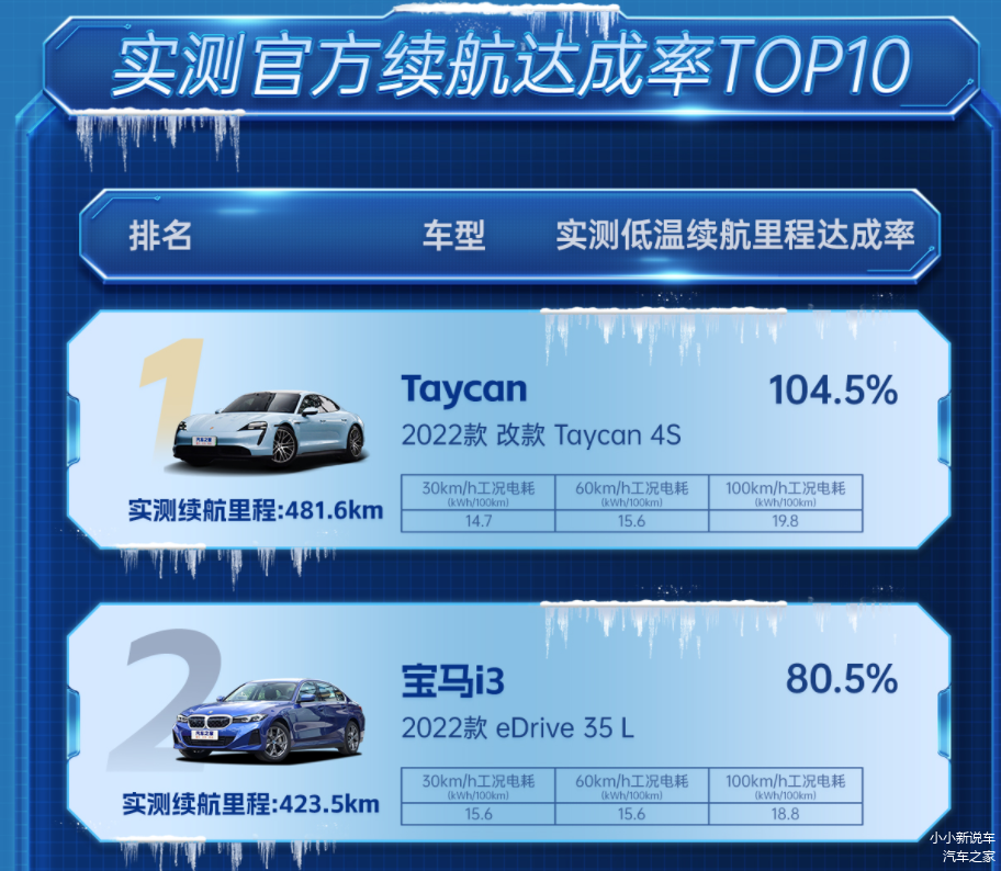每到冬天,新能源车型的续航表现就成为了关注度的焦点问题之一,近期汽车之家进行了一项新能源冬季续航测试,在测试中有些车型的成绩确实给我们带来了惊喜。汽车之家超级测试创新性打造“冬季双温区”能耗测试,在环境温度8-10℃以及-20℃到-30℃的呼伦贝尔为您带来30km/h、60km/h以及100km/h平均车速工况下的续航能耗测试,以及增程/插电混动车型纯电续航里程测试中,实测官方续航达成率TOP 10中,宝马i3实测续航里程423.5km,续航达成率达到了80.5%。