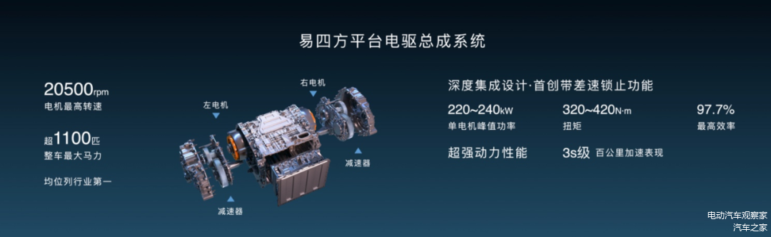 秀出了以“易四方”为名的四电机独立驱动为核心的动力系统,及其带来的极致安全和极致性能;