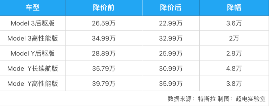 当时在售的Model 3/Y车型均下调了售价,其中Model 3后驱降价1.4万,高性能版降价1.8万,Y车型降价更狠,后驱版降价2.8万,四驱版降价3.7万。