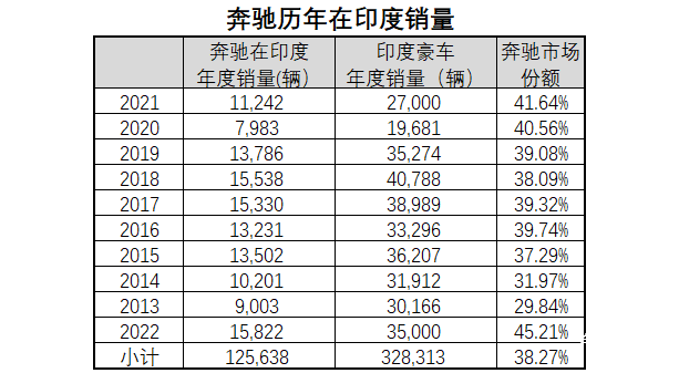 2022年,奔驰不但在销量上创新高,在印度豪车市场上的市场份额也有扩张。2022年印度豪车市场销量估计大约有3.5万辆,奔驰的市场份额达到45.21%。在印度豪车市场中市场占有率接近5成。是奔驰进入印度市场以来的最高水平。
