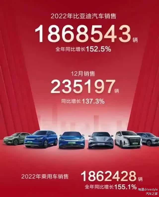 结果再看看国内与它的最强竞争对手比亚迪,2022年交出了一份满分答卷。2022年全年,比亚迪全球累计销量达到186.9万辆,同比增长152.5%,反超特斯拉54.7万辆,重回阔别三年之久的销冠宝座。其中,新能源汽车累计销售约186.35万辆,同比增长208.64%,相当于翻了3倍。而12月单月销量达到235197辆,同比增长137.3%。