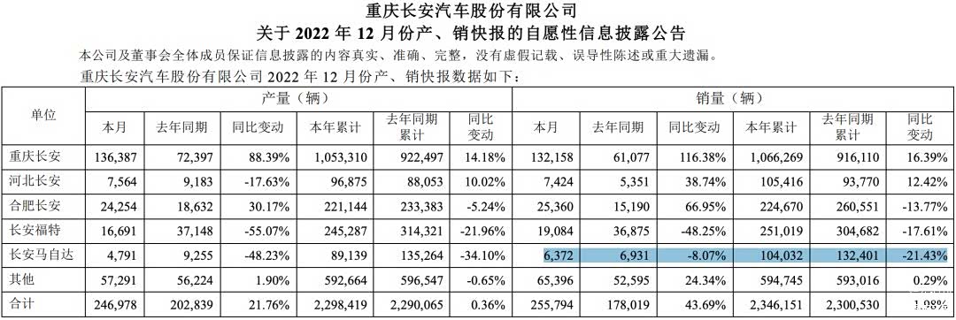 据长安汽车公布产销数据显示,2022年长安马自达全年销量104,032辆,同比下滑21.43%,其中12月销量6,372辆,同比下滑8.07%。