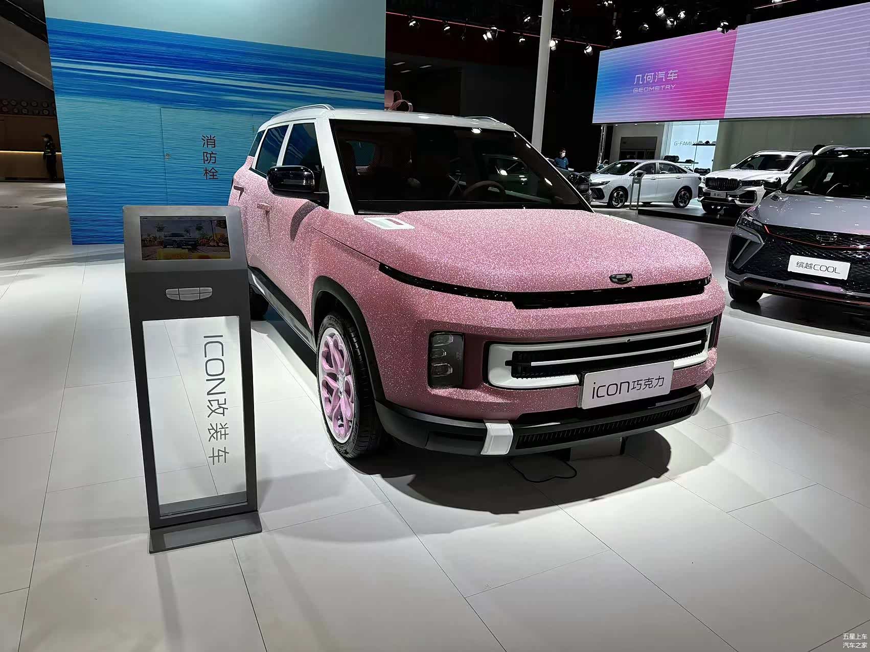 吉利ICON巧克力改装版在2022广州车展亮相。新车整体采用粉色涂装,并融入bulingbuling元素,视觉效果突出。外观方面,吉利ICON巧克力采用异彩美学设计理念,整体更加时尚。具体来看,新车前格栅采用内凹的“弓字型”元素,整体分上、中、下三部分,在加强视觉层次感的同时,也让车辆更具辨识度。同时,新车上方的日行灯横向嵌入在前发动机舱该上,十分动感。 车身侧面来看,新车将A/B/C柱进行黑化处理,营造出当下流行的悬浮式车顶设计,搭配下方艳丽的车漆配色以及隐藏式门把手,在增添时尚感的同时,也加强了科技感。内饰方面,新车采用了三辐式多功能抗菌涂层方向盘,搭配由12.3英寸中控屏+10.25英寸全液晶仪表组成的720mm悬浮式双联屏。