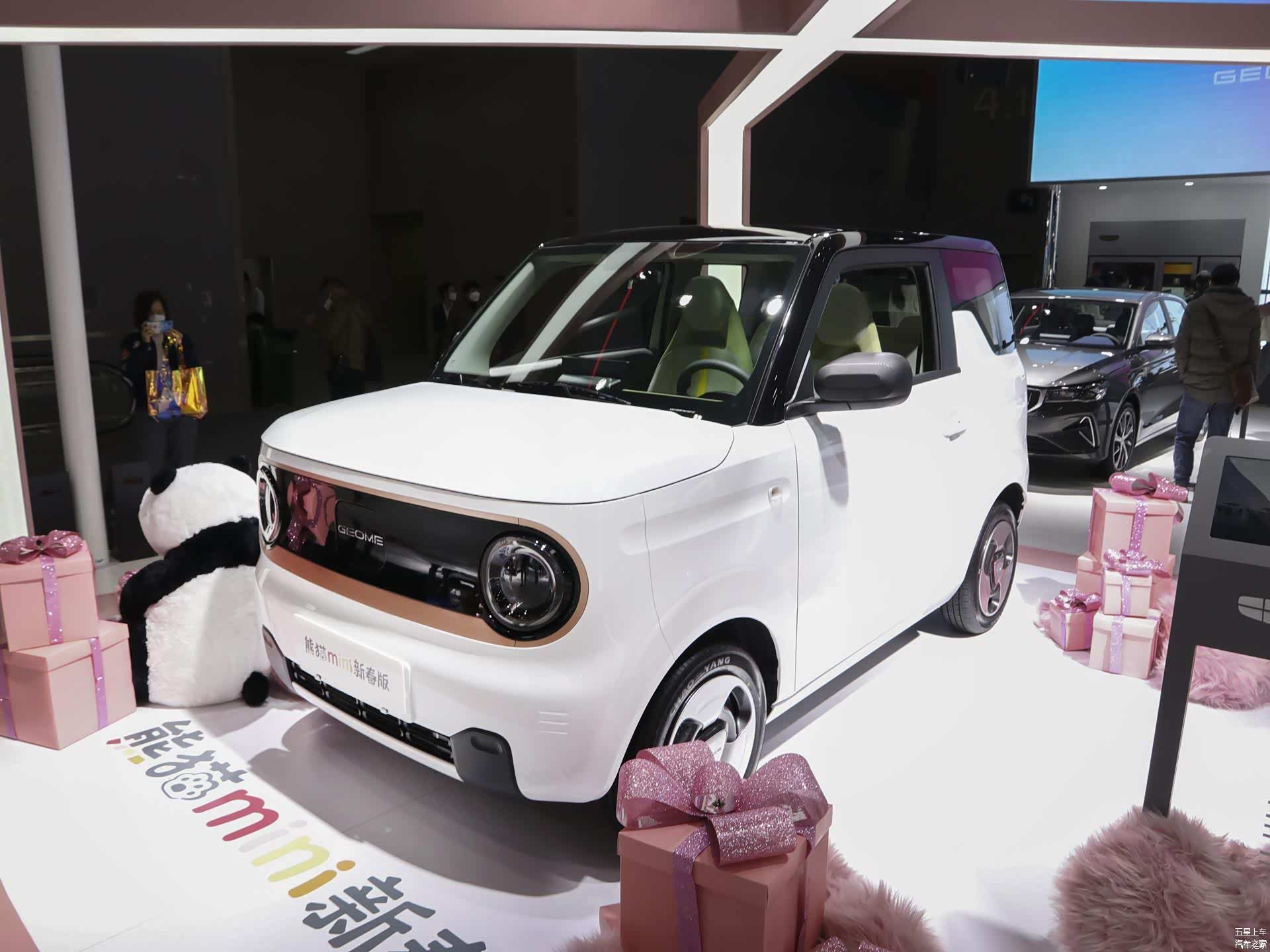 吉利熊猫mini新春版在2022广州车展亮相。新车基于熊猫mini顶配版打造,售价为5.58万元。外观方面,作为特别版车型,其整体依旧沿用普通版车型的设计风格,仅是在细节上进行调整。具体来看,新车采用微型车惯用的小方盒子造型,整体十分具有辨识度。同时,其前脸采用窄条幅封闭式前格栅,并在格栅边缘加入玫瑰金色饰条进行装点,配合圆形的大灯组,整体十分可爱。内饰方面,整体采用十分简洁的设计风格,9.2英寸窄条幅式液晶仪表搭配8英寸的悬浮式中控屏,整体的科技感较强。配置方面,新车配备电子中控锁、大灯高度可调、车门电动车窗等舒适便利配置。