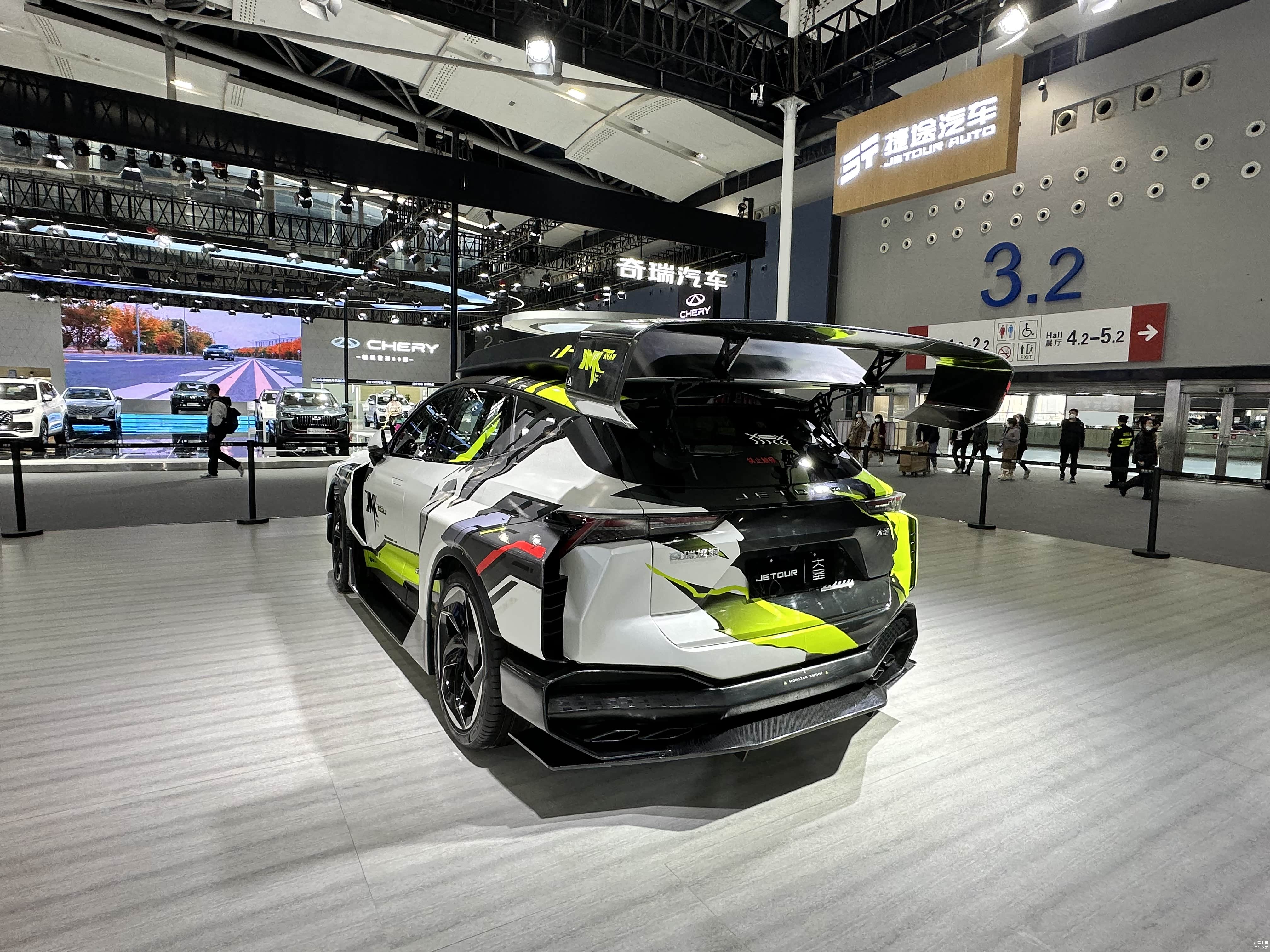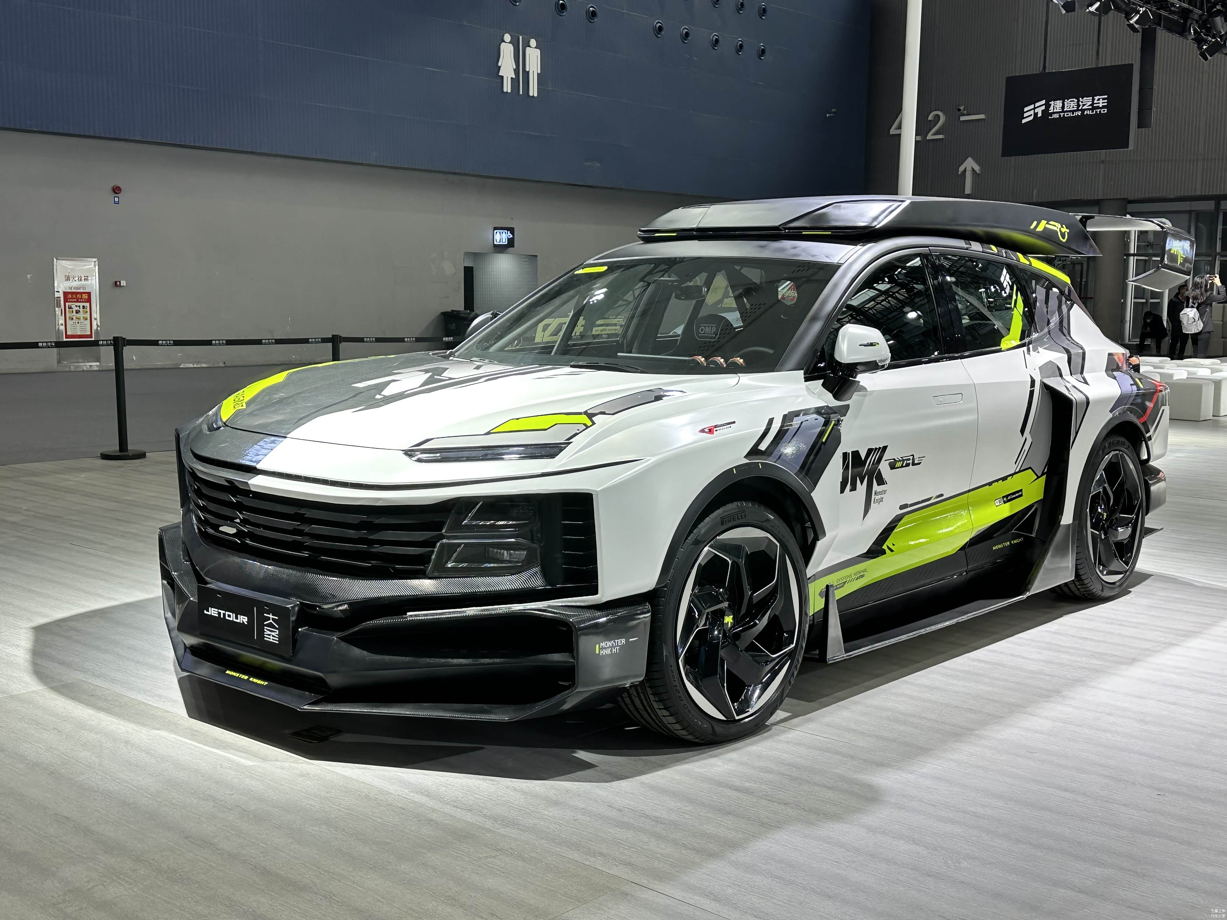 捷途大圣MONSTER KNIGHT 改装版在2022广州车展亮相。新车以黑色搭配白色作为主色调,并采用绿色进行点缀,辨识度非常高。前脸依旧采用大尺寸进气格栅,搭配前扰流板,具有比较强的视觉冲击力。侧面来看,新车在轮眉处增加了宽体效果,并配备有侧裙扰流板。尾部大尺寸扰流板十分夸张,配合下方扩散器设计,展现出不俗的运动感。