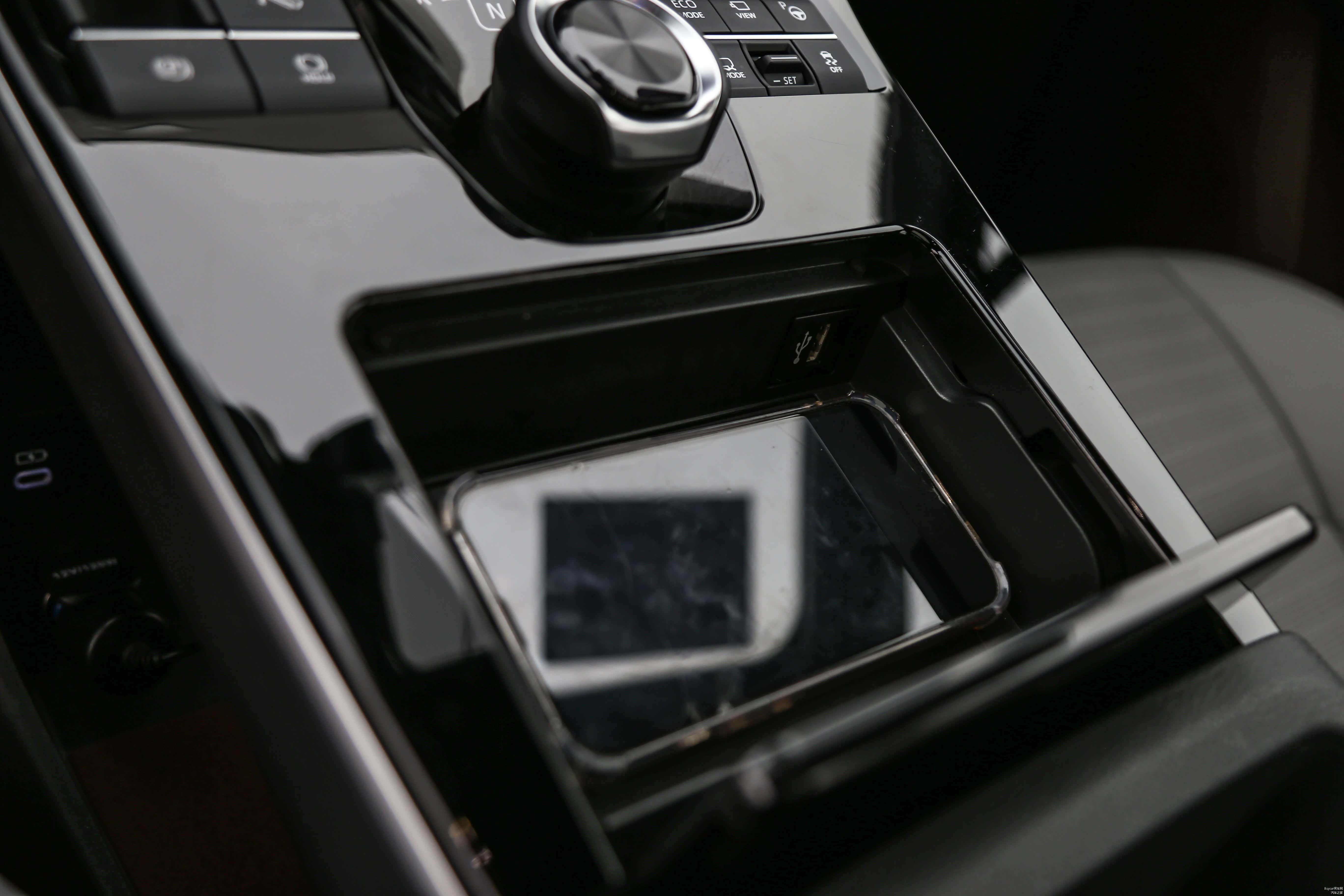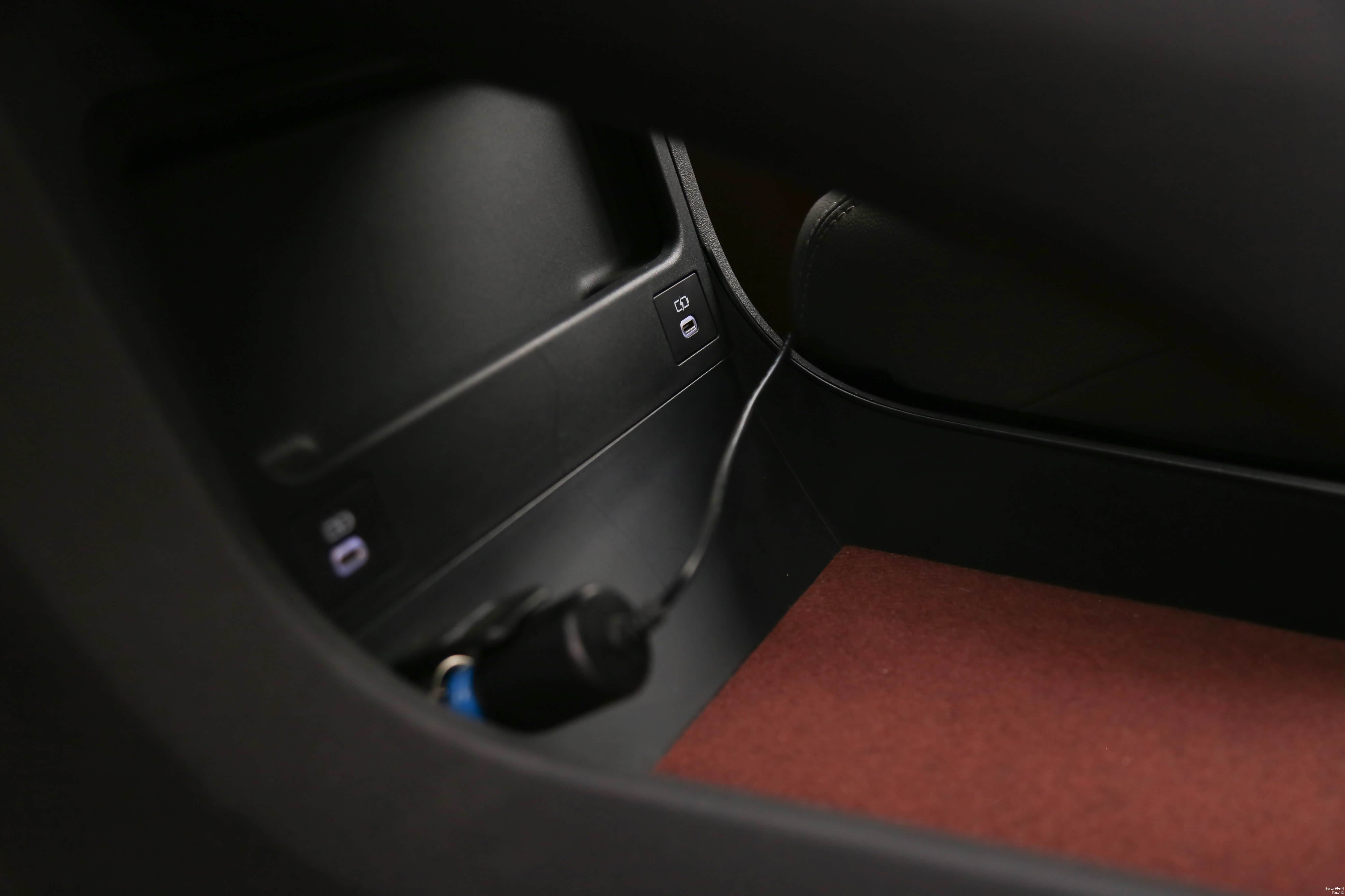 中控抬底部设有一处大型储物区域,就算是女性随身携带的包也可以容纳其中,并且该区域中还配备了USB接口,以便于前排人员充电使用。