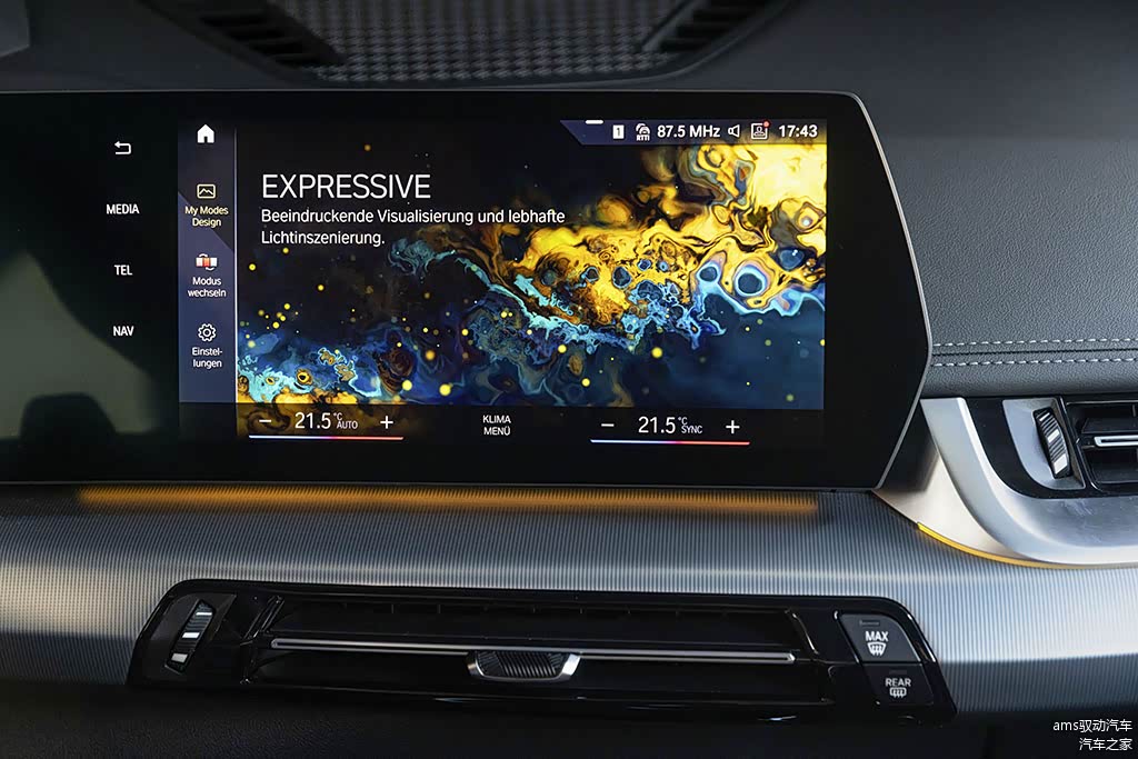 和大型iX一样,操作系统倾向驾驶员一侧,10.2英寸大的显示屏仿佛扑面而来,对副驾驶而言操控比较难。好吧,这主要因为下拉菜单中的App看起来都很小,自动空调也要通过触摸屏来控制。想把所有重要的小工具和快捷方式设置到位,确实需要点时间。好在宝马在车内安装了直觉响应式语音辅助,方向盘上也有真正的按键和转轮。