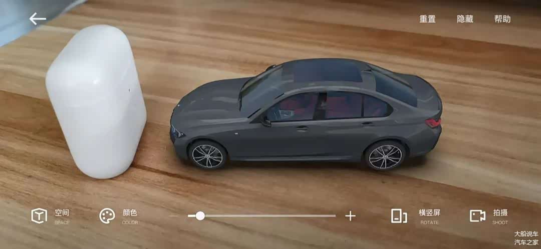 你也可以选择 AR,把汽车模型投影到手机摄像头对着的地方,手机拿着会晃,体验没有上边模拟时好,也就是好玩一点。
