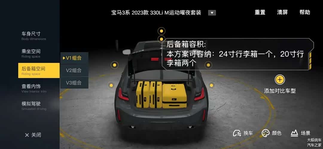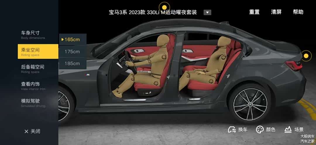 可以把 165cm、175cm、185cm 三种身高的假人放到车座上,让用户相对直观地查看车内空间。