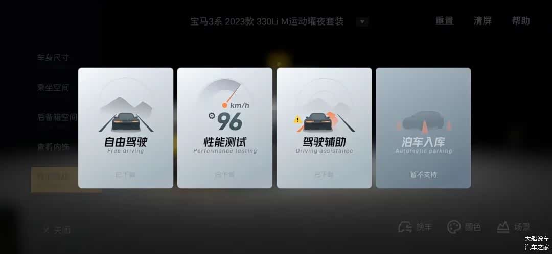 这个模块有一定趣味性,用户可以自由驾驶、性能测试(百公里加速、刹车距离)、驾驶辅助。