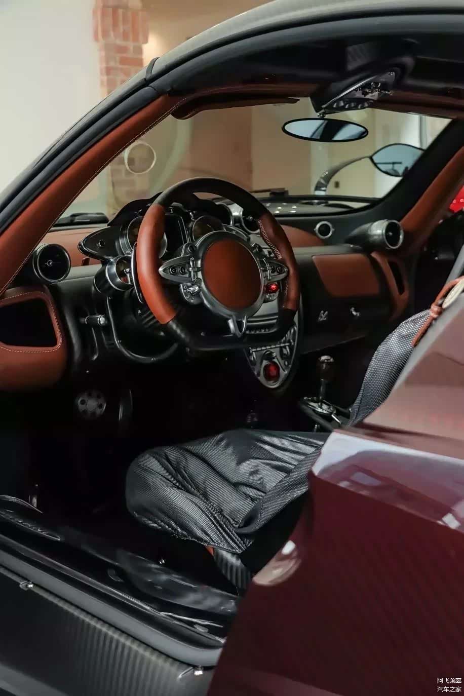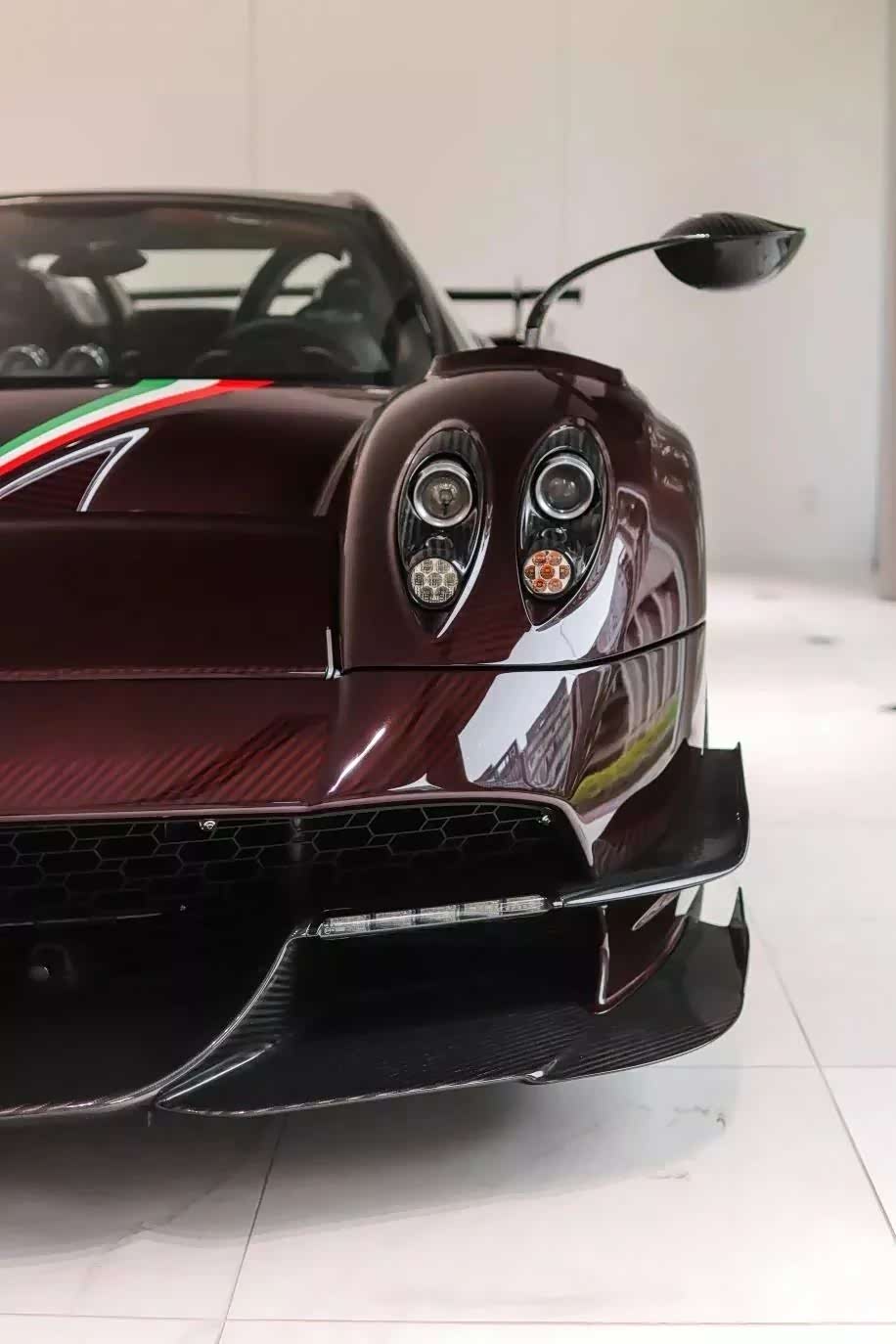 我特别喜欢这辆车的选配。目前,全球没有任何一家汽车制造商能像帕加尼那样完美的运用如此复杂的彩色碳纤维,照片里这辆车使用了深红色的碳纤维车身,看起来相当吸引人!不过在很多细节处,该车使用了较为传统的裸碳设计,比如扩散器、尾灯环绕、后翼、车顶、发动机盖等。