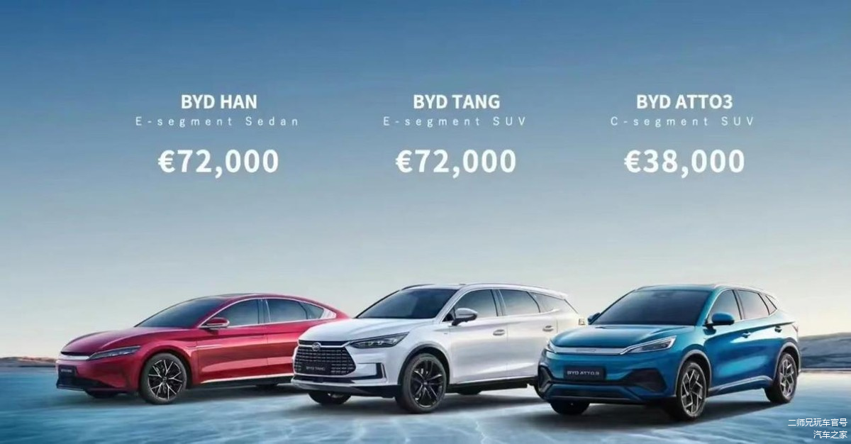 比亚迪唐和比亚迪汉,在欧洲的起售价均达到了7.2万欧元,比亚迪元(ATTO 3)的起售价也达到了3.8万欧元。