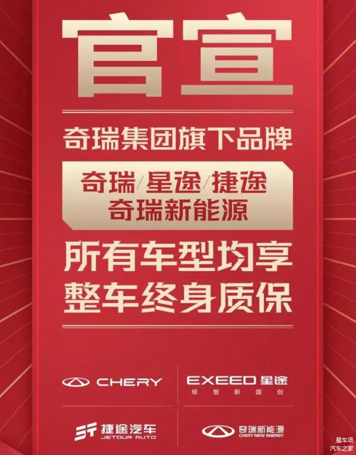 2月1日,奇瑞正式官宣“全系整车终身质保”政策。宣布自今年1月1日起,凡购买奇瑞集团旗下星途、奇瑞、捷途、奇瑞新能源四大品牌全系车型均可享受整车终身质保政策,在业内引起不小的轰动。