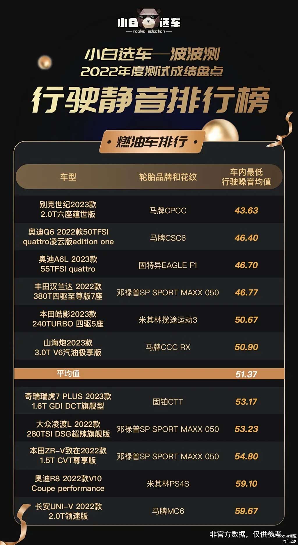 接下来我们看看各细分市场的静音王。首先是燃油车阵营。2022燃油车静音均值51.37,占据榜首的是别克世纪2023款2.0T六座蕴世版,成绩是43.63 dBA——这也可以视为是马牌CPC系列轮胎的又一次胜利。
