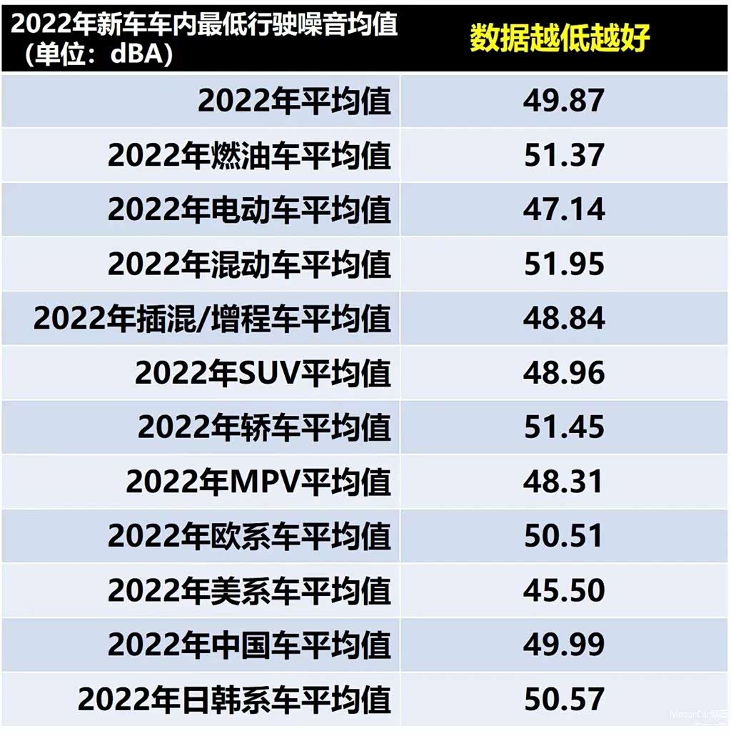 最后,是各细分市场行驶静音均值表单,这个表单将作为2023年我们评量新车行驶静音性的依据——小于均值,静音就好;大于均值,静音就差。