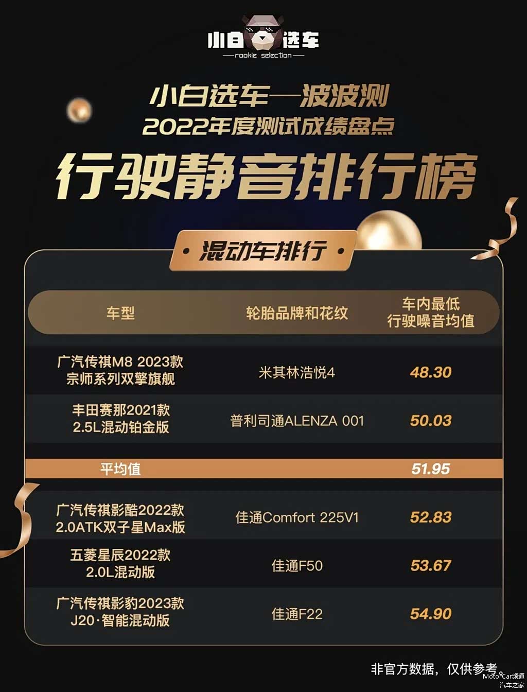 广汽传祺M8 2023款宗师系列双擎旗舰以48.30 dBA的成绩,在均值高达51.95 dBA的混动车阵营中夺魁。其实这还不是最重要的——同样的都是丰田THS混动系统,广汽传祺M8干掉了自己的老师丰田赛那,这才是亮点。