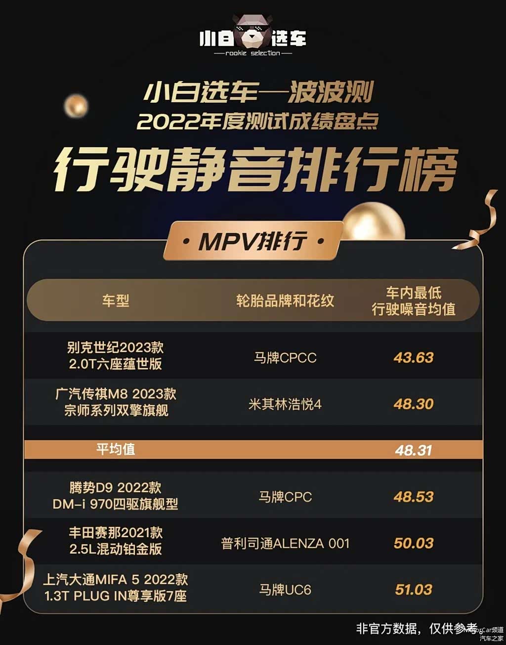 之前MPV的操控榜是让大家看个新鲜,如今MPV的静音榜才是实力的体现。去年MPV新车的静音测试平均成绩达到48.31 dBA,优于SUV和轿车的成绩。当然,霸榜的依旧是上汽通用斥重金打造的别克世纪。