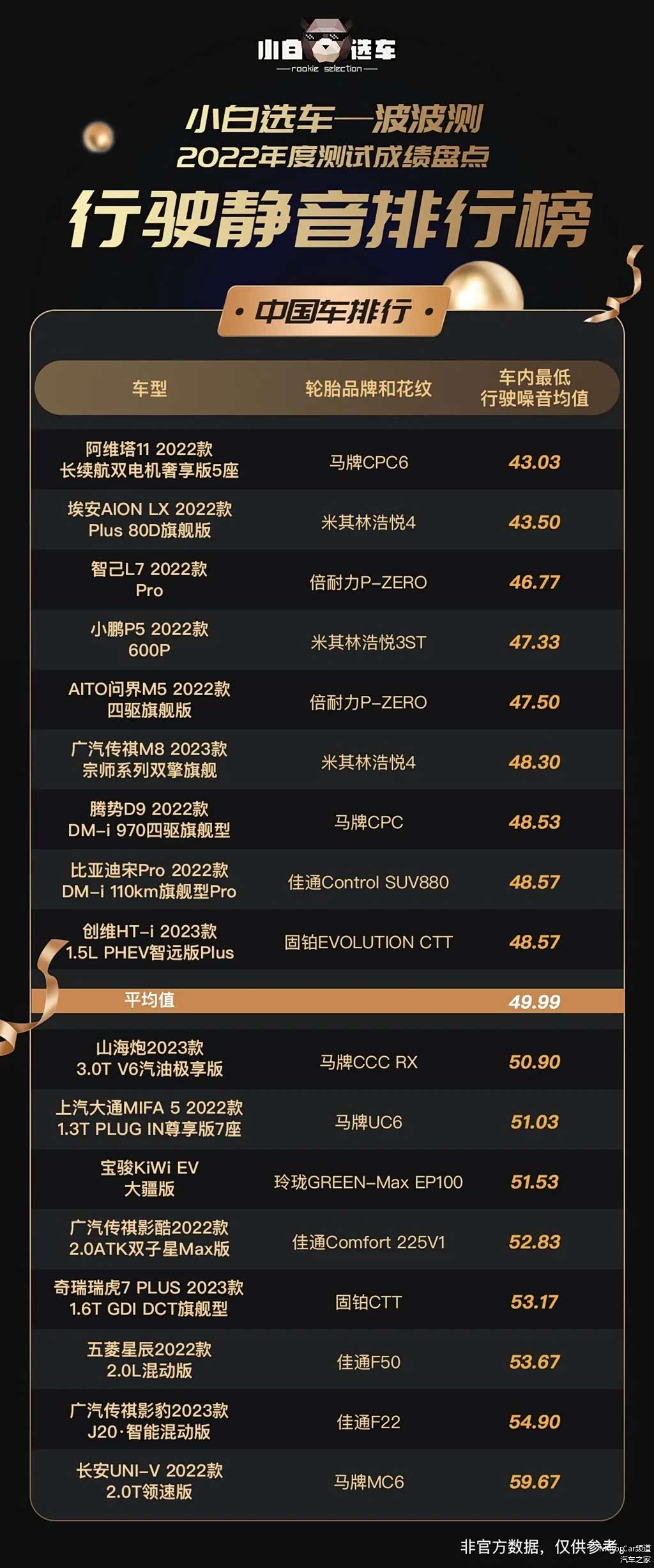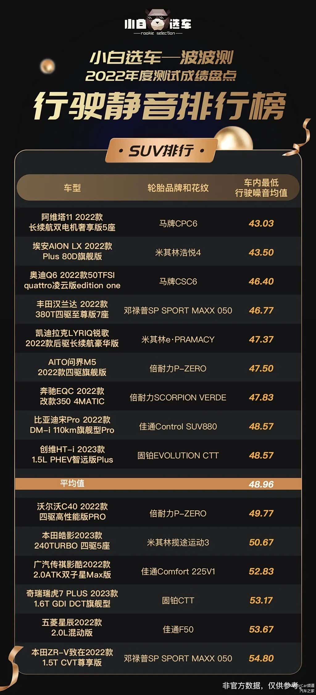 2022年SUV新车静音榜的平均成绩是48.96 dBA,霸榜的依旧是阿维塔11。