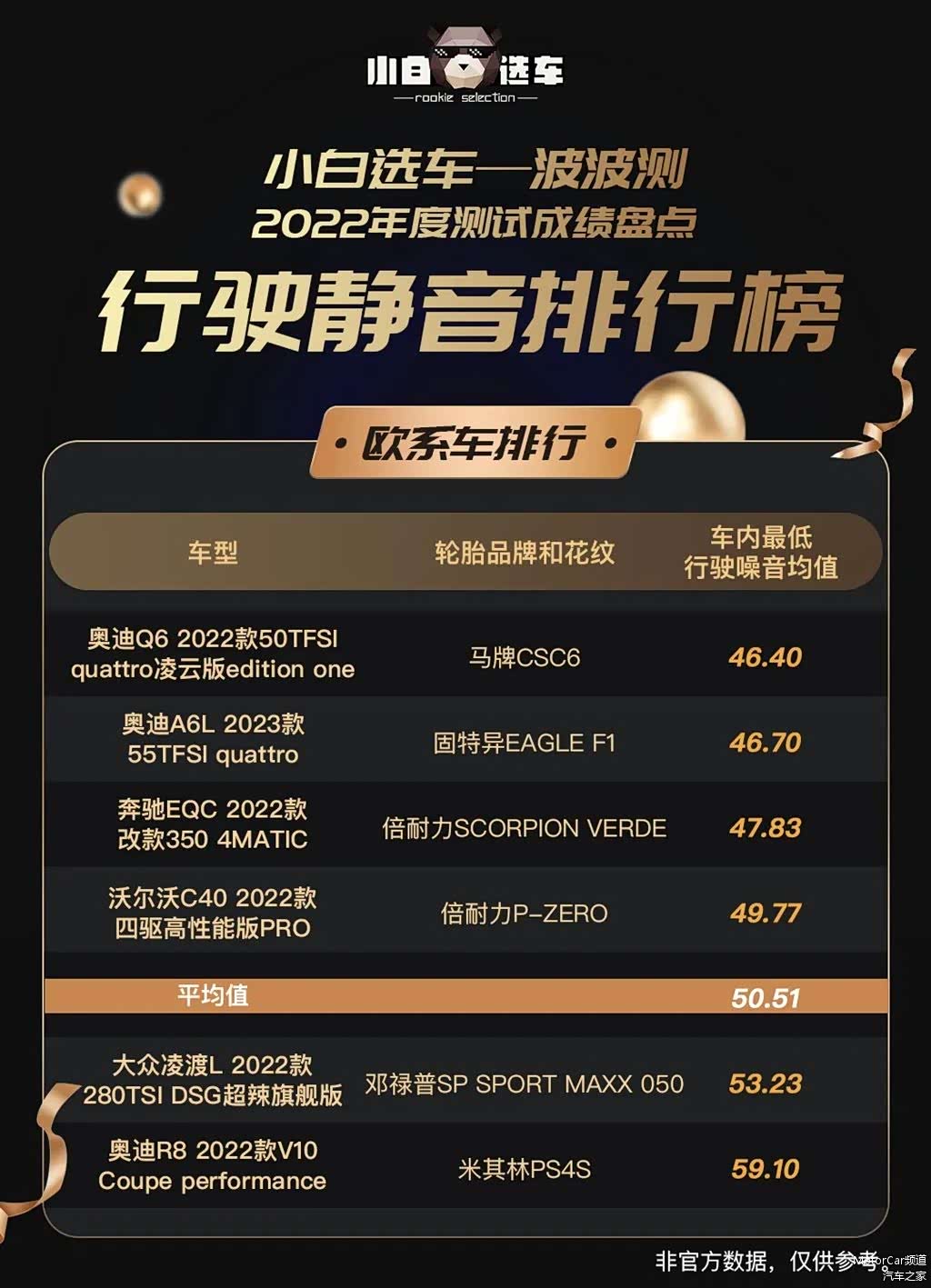 在这份榜单中,除了一款沃尔沃C40来自瑞典之外,其余的全部都是德系车。欧系车的平均静音成绩达到了50.51 dBA,这个数据说实话并不怎么好。占据该榜单榜首的是奥迪Q6 2022款50TFSI quattro凌云版edition one,成绩为46.40 dBA。