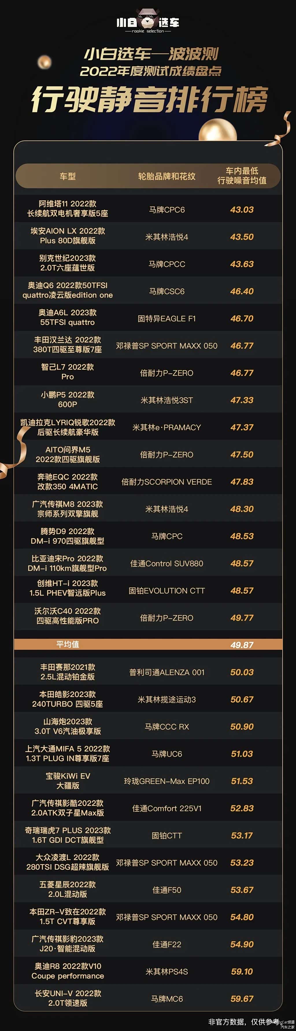 不过2022年新车静音榜的均值为49.87 dBA,相对于2020年均值49.37 dBA和2021年均值47.69 dBA来说反而变差了。这是一个相当有意思的现象。