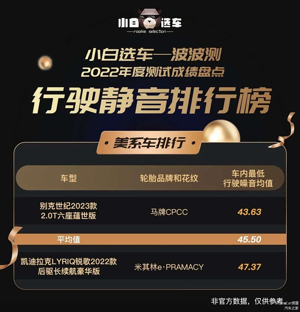 这个榜单最有意思,就两款车,但成绩都相当不错,均值达到45.50 dBA。霸榜的依旧是别克世纪。