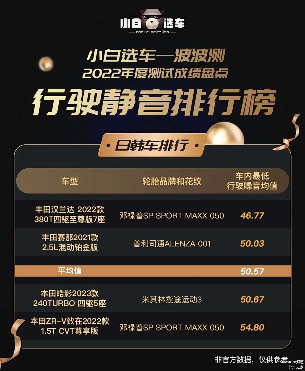 2022日韩系新车静音榜上排名第一的是丰田汉兰达 2022款380T四驱至尊版7座,成绩是46.77 dBA。这意味着丰田汉兰达 2022款380T四驱至尊版7座不仅是静音性最好的日系车,同时也是操控极限最高的日系车——在2022日韩系新车操控榜上,丰田汉兰达 2022款380T四驱至尊版7座已经霸过一回榜了。由此见得,进入TNGA时代之后,丰田车在整体上的提升其实是有目共睹的。至于本田车则全部垫底,静音性上丰田虐压本田,没毛病。