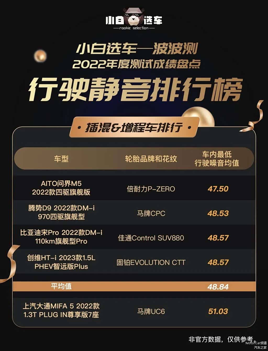 2022插混&增程车静音榜的平均成绩是48.84 dBA,由此可见插混版的上汽大通MIFA 5拖了后腿——实际上只有这款车的数据低于该细分市场的平均成绩。