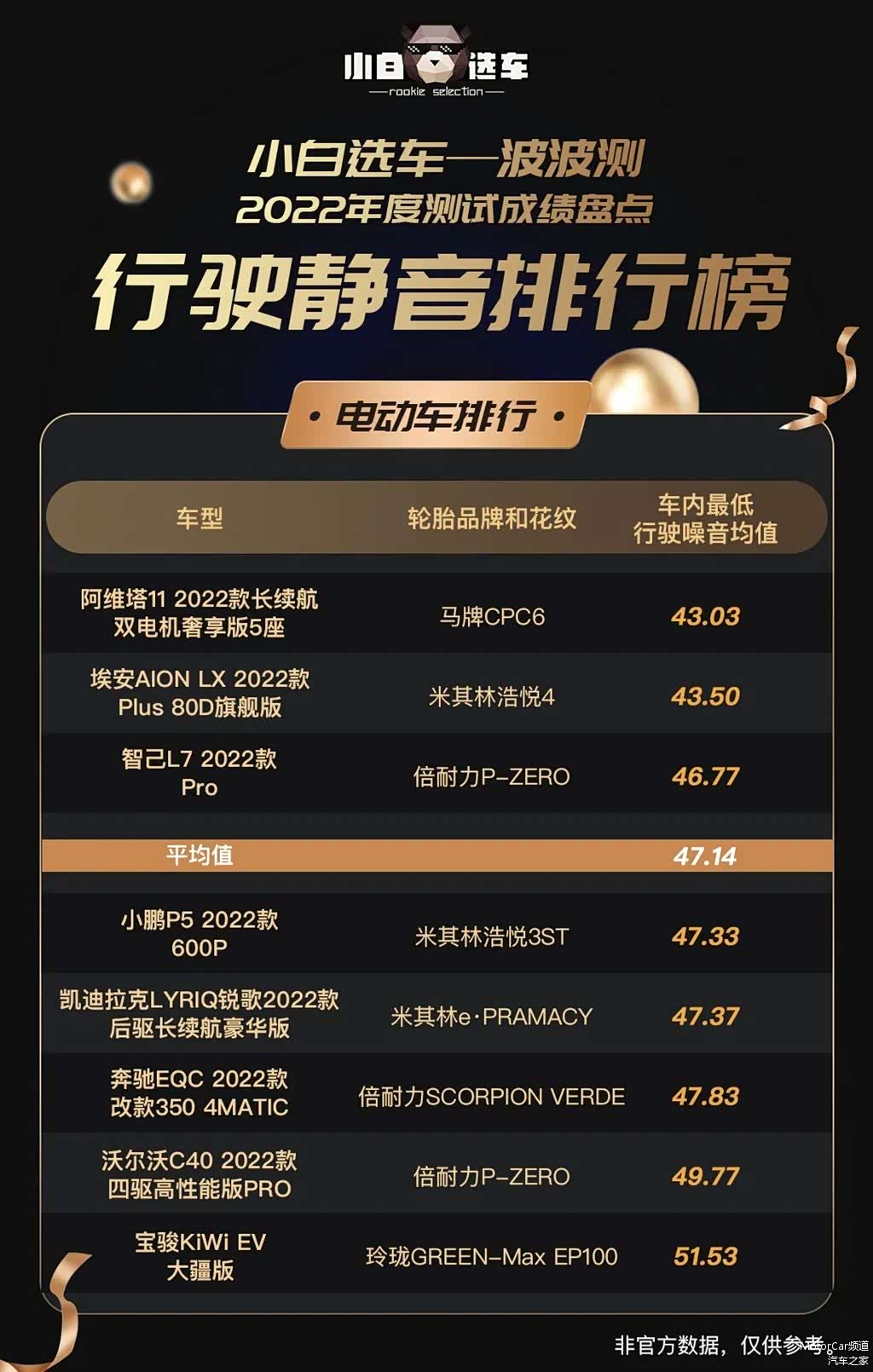 2022年电动车的静音王依旧是阿维塔11,就平均成绩而言,去年电动车的静音平均值达到了47.14 dBA,在以动力类型区分的各细分市场榜单中,这个成绩是最好的。所以说电动车最安静,其实是有道理的。