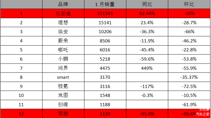 据相关媒体统计,2023年1月份新能源汽车品牌中,环比均出现了下滑趋势,其中下滑力度最大的是零跑汽车,1月销量仅有1139辆,环比下降高达86.6%,同比也下降85.9%,销量最高的仍然是比亚迪,1月销量达到了151341辆,同比上升62.44%,但环比下降了35%。
