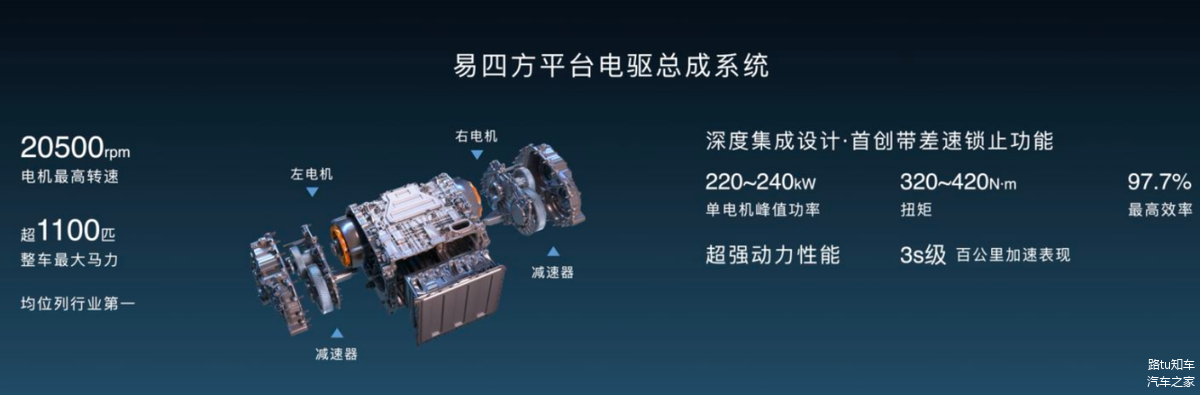 该技术平台是一套以四电机独立驱动为核心的动力系统,可通过感知力更强的电驱系统,以毫秒级的速度调整轮端动态,对每个车轮扭矩和动力输出进行精确控制,能够规避传统燃油车反应慢、效率低、功率低、四轮差异化程度低等问题,在爆胎等极端情况下也能精准地稳定车身。“易四方”技术寓意四电机带来想象空间的革命性突破,是一次对汽车动力架构的全面革新。