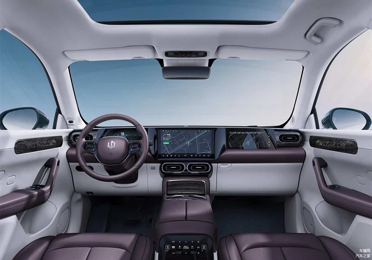 内饰部分,C11增程式版同样延续了纯电动版车型的设计,标志性的三屏联动并未缺席,双色的内饰配色以及木纹饰板、金属边框等装饰都处于同类型产品中的上乘水准。