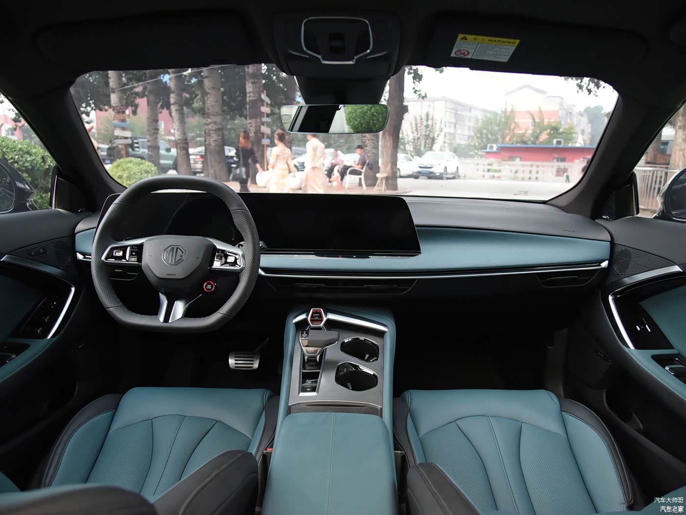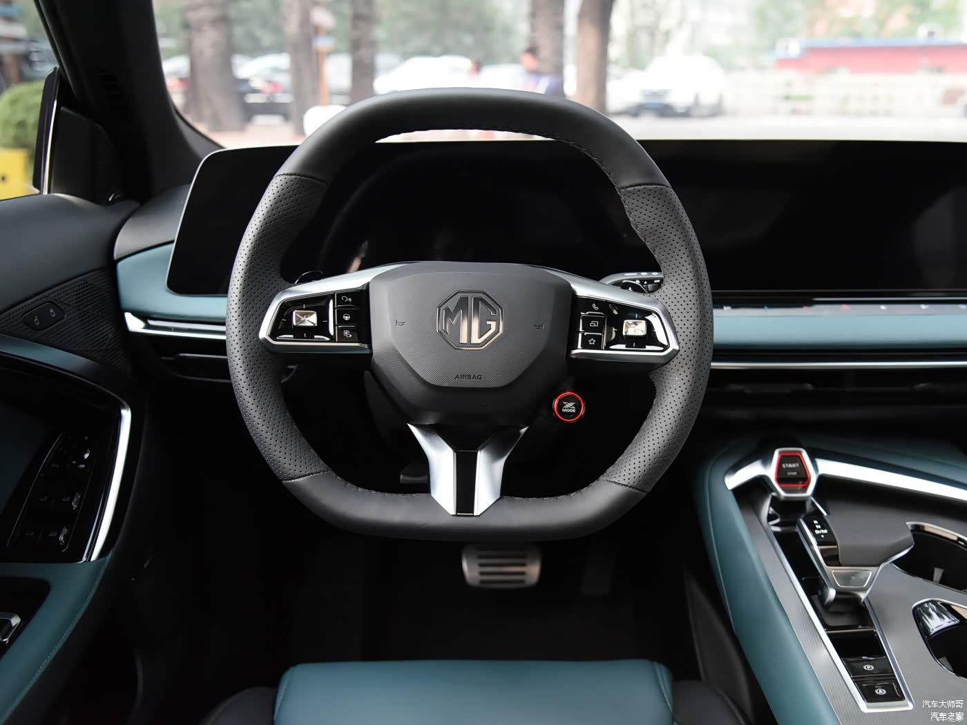 内饰方面,中控台经过平直线条勾勒之后营造出不错的层次感,在用料方面也极其厚道不仅采用了大面积软性材质而且细节上加入了黑色钢琴烤漆与银色镀铬进行点缀,从而提升了车内的质感。而一体式悬浮触摸屏、贯穿前舱的饰条与氛围光、弱化的出风口等细节,无不呈现出感性和优雅的格调。全新MG7的方向盘采用了家族式三辐设计,左右两侧配备了打孔真皮,增加了抓握的摩擦力。