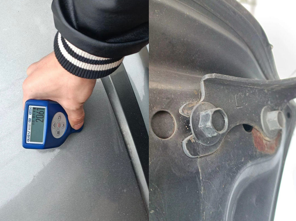 随后检测全车ABCD柱这些结构件,可以看到左右两边D柱都存在钣金修复,长度超过8cm且厚度也大于了400微米,按照国标定义,已经达到了事故车的认定标准,看来后部有过事故,D柱都受伤了,估计后背盖也跑不了,打开看看。