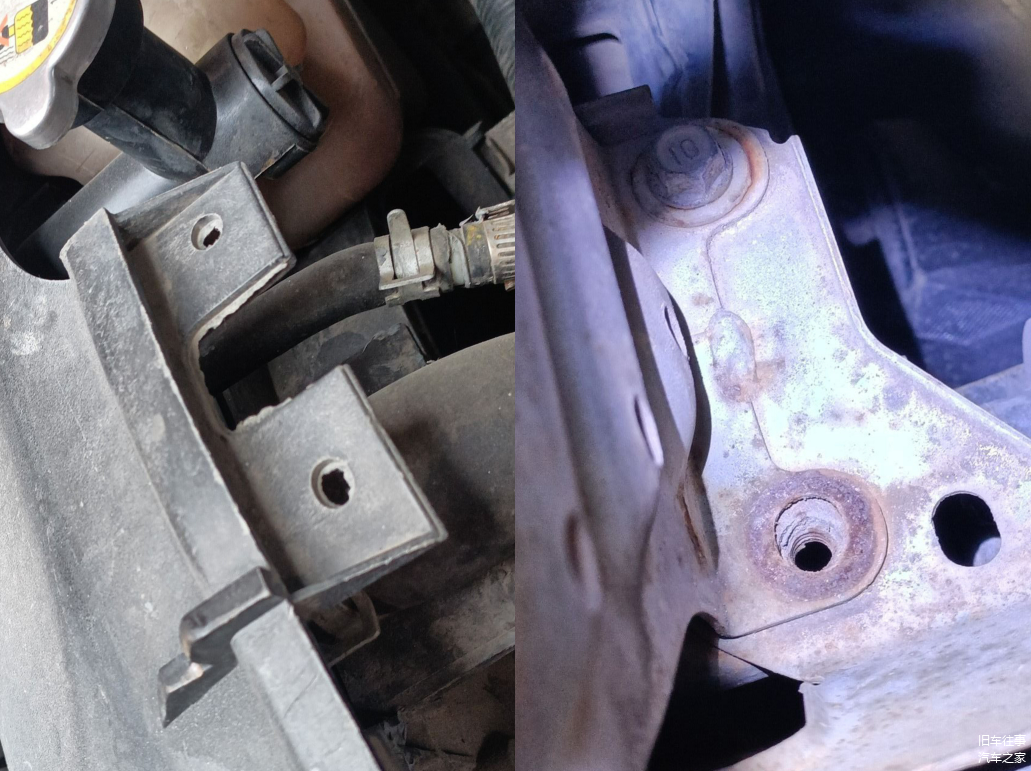 再往里面看,水箱框架拆卸更换,看水箱框架上的毛边就知道更换了,前防撞梁拆卸,现在还少了一颗固定螺丝,好家伙,不掉就行了呗。好在前纵梁和两边的加强粱没有存在变形修复痕迹,看来当时车头的撞击力度不是太大,只伤到了最外面的一些覆盖件。