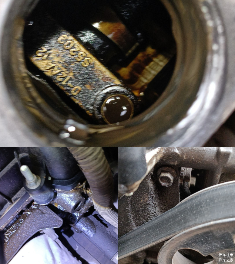接着检测发动机部分,打开加油盖,这积炭可真厚,气门室盖和前端盖漏油已经漏得结痂了,有点强迫症的我真想拿一瓶化清剂给它冲一下。就这状态完全不像表显8万多公里的样子,怕还是个调表车哦!阿豪我保守估计这车起码都在十五、六万公里以上了,待会严查。