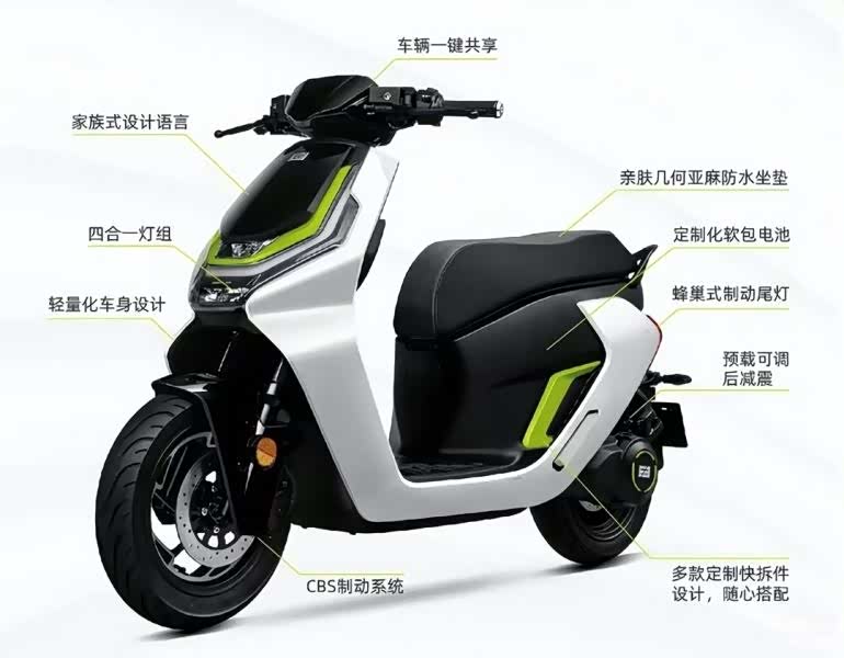 AE6采用驱动总成采用四合一侧挂结构,将电机、电控、减速器、后平叉四合一,搭载由蓝石提供的2.5kW侧挂电机,速度可达100km/h。还具备750w极速充电功能,支持3小时满电,另外拥有制动能量回收系统。