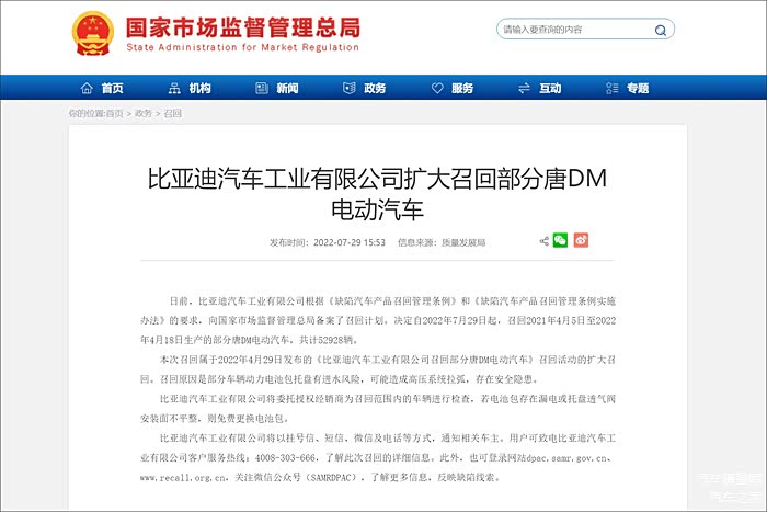 2022年7月29日,国家市场监管总局另一则召回通告披露比亚迪扩大了唐DM召回范围,决定自即日起召回2021年4月5日至2022年4月18日生产的52928辆唐DM电动汽车。召回的原因是“部分车辆动力电池包托盘有进水风险,可能造成高压系统拉弧,存在安全隐患。”