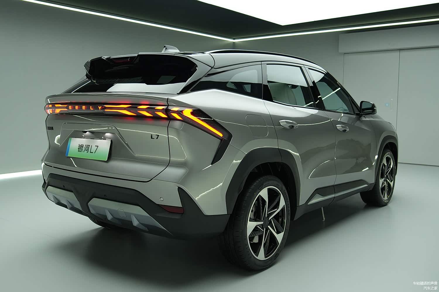 对于车侧的设计来说,官方给出的定义是银河L7采用的是伏虎设计,虽然我听的也不太明白,但是从视觉冲击感来看,它的车身侧面很饱满,并且接近于轿跑SUV的设计风格,让它侧面的运动气息十分浓郁,双色的车身颜色更是展现出了年轻人喜爱的一面。
