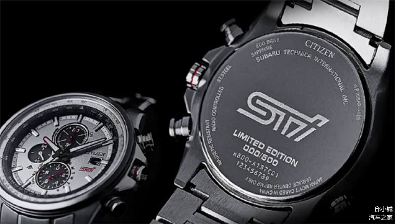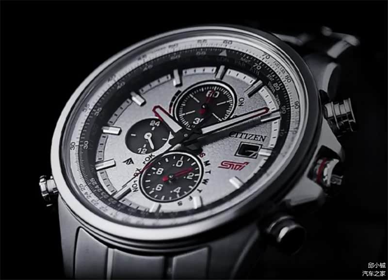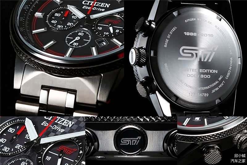 这款腕表采用了西铁城著名的光动能技术,可以将各种不同形式的光转化为电能,保证精准走时的同时免除了用户频繁更换电池的烦恼。表盘上我们可以清晰看到日期显示、60分钟计时、24小时指示等功能,指针和表冠上带有红色涂装和红色线条装饰,表背刻有STI专属标识以及限量500的标识。