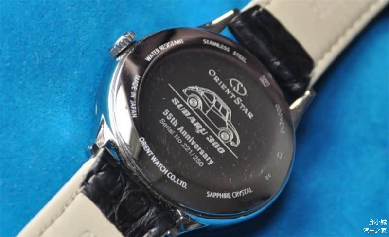 ORIENT STAR东方星是东方双狮表旗下的高端子品牌,和斯巴鲁一样品牌中带有星星元素。他们联手推出了一款斯巴鲁360 55周年的纪念表款,样式十分简约,配色复古,从表背看这款腕表限量250枚。