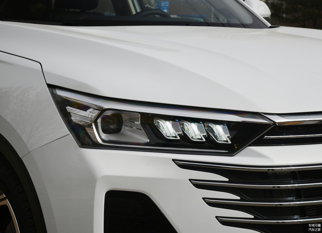 前大灯依旧沿用老款样式,不过内部灯组重新进行了设计,官方称之为“三点复眼式科技感前大灯”,远光灯和近光灯采用一体式透镜结构,日行灯与前位置灯功能复用,两侧大灯用一条镀铬饰条进行连接,内部辅以横向镀铬饰条进行装饰,更显精致。